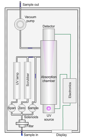 為了確定臭氧濃度,泵將環境空氣樣本通過過濾器吸入吸收室,在吸收室中,來自汞蒸氣燈的波長為 254nm 的紫外線照射樣本。