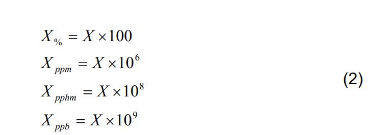 這通常是一個非常小的數(shù)字,因此混合比通常以百分比、百萬分之幾、億分之幾或十億分之幾(全部按體積,而不是質量)表示,如下所示: